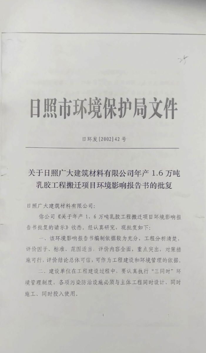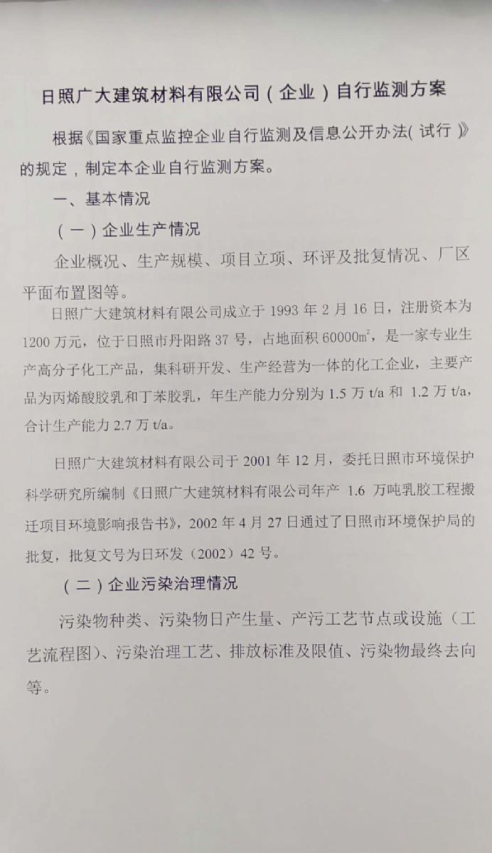 日照廣大建筑材料有限公司,位于風(fēng)景秀麗的海濱城市山東日照,成立于1988年,是專業(yè)生產(chǎn)高分子化工產(chǎn)品,集科研開發(fā)、生產(chǎn)經(jīng)營為一體的化工企業(yè),主要產(chǎn)品為丙烯酸脂類乳液和丁苯膠乳。是國內(nèi)目前江北同行業(yè)產(chǎn)銷量最大企業(yè)之一。